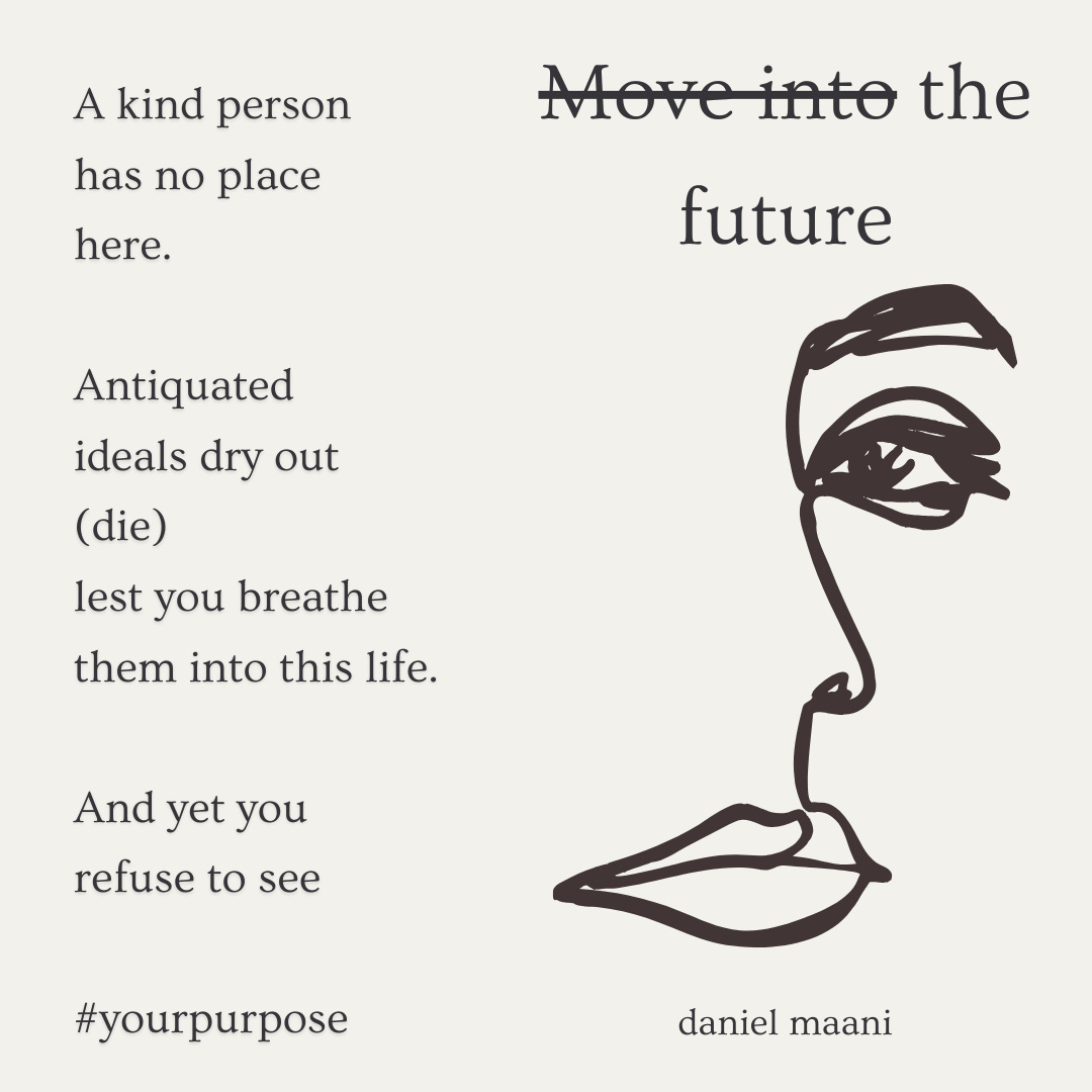 Move into the future A kind person has no place here. Antiquated ideals dry out (die) lest you breathe them into this life. And yet you refuse to see #yourpurpose