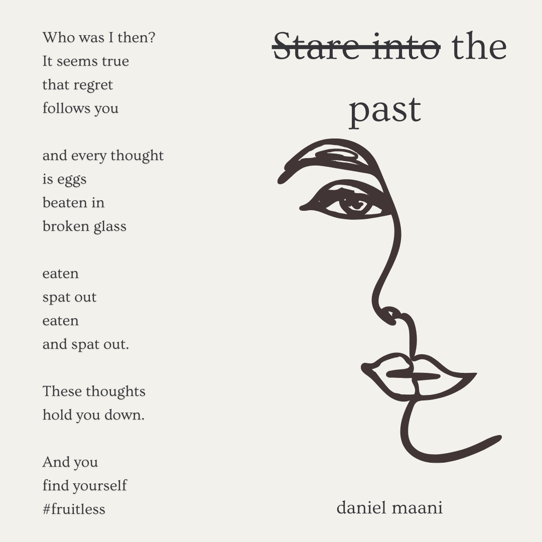 Stare into the past Who was I then? It seems true that regret follows you and every thought is eggs beaten in broken glass eaten spat out eaten and spat out. These thoughts hold you down. And you find yourself #fruitless